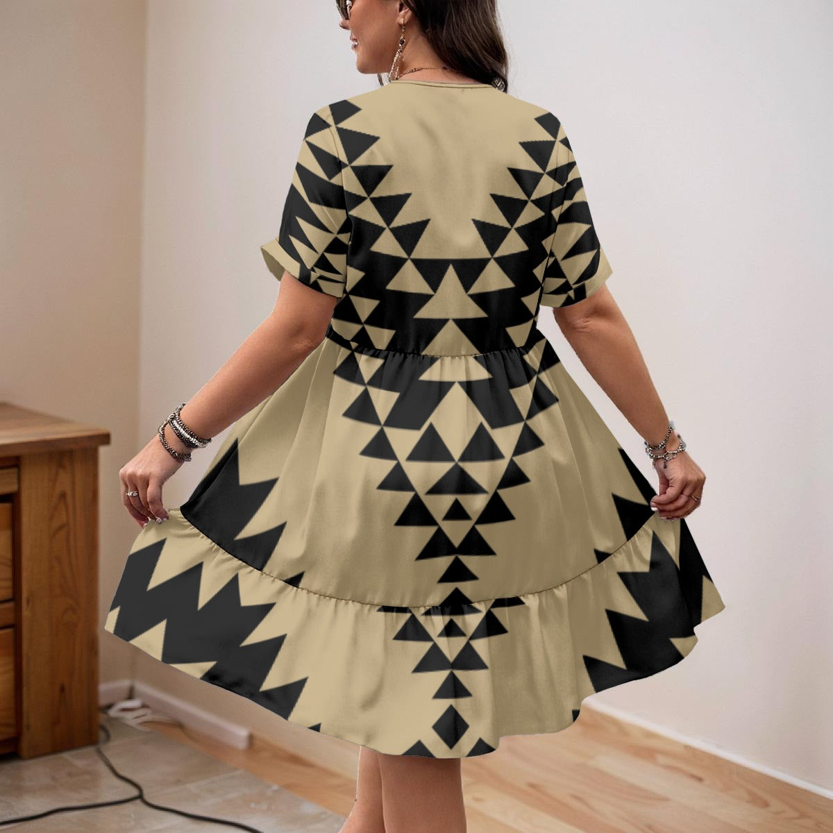 This lovely V-neck floral dress is made from a lightweight, non-stretchy four-sided woven fabric that has a smooth hand feel and drapes comfortably. The silhouette is cut in a relaxed A-line with a fitted V-neck and soft short sleeves.
